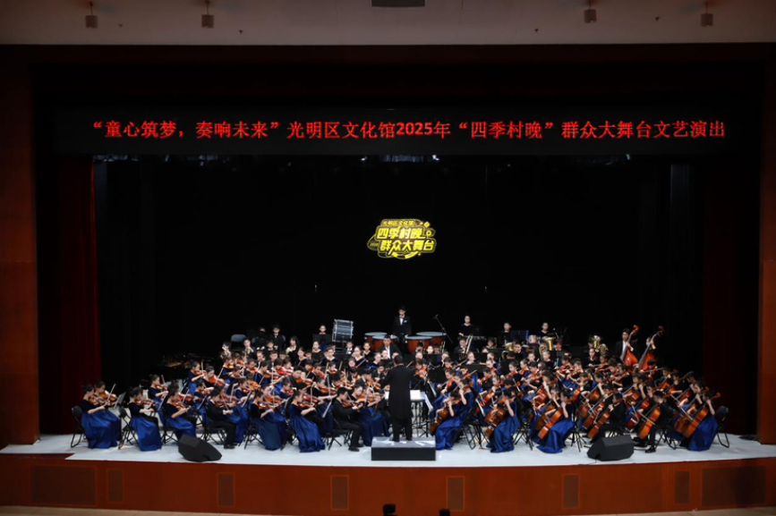12月28日晚,光明区文化馆剧场内乐声激昂、掌声如潮,2025年度“四季村晚”群众大舞台收官演出——“童心筑梦 奏响未来”交响音乐会在此华彩上演。