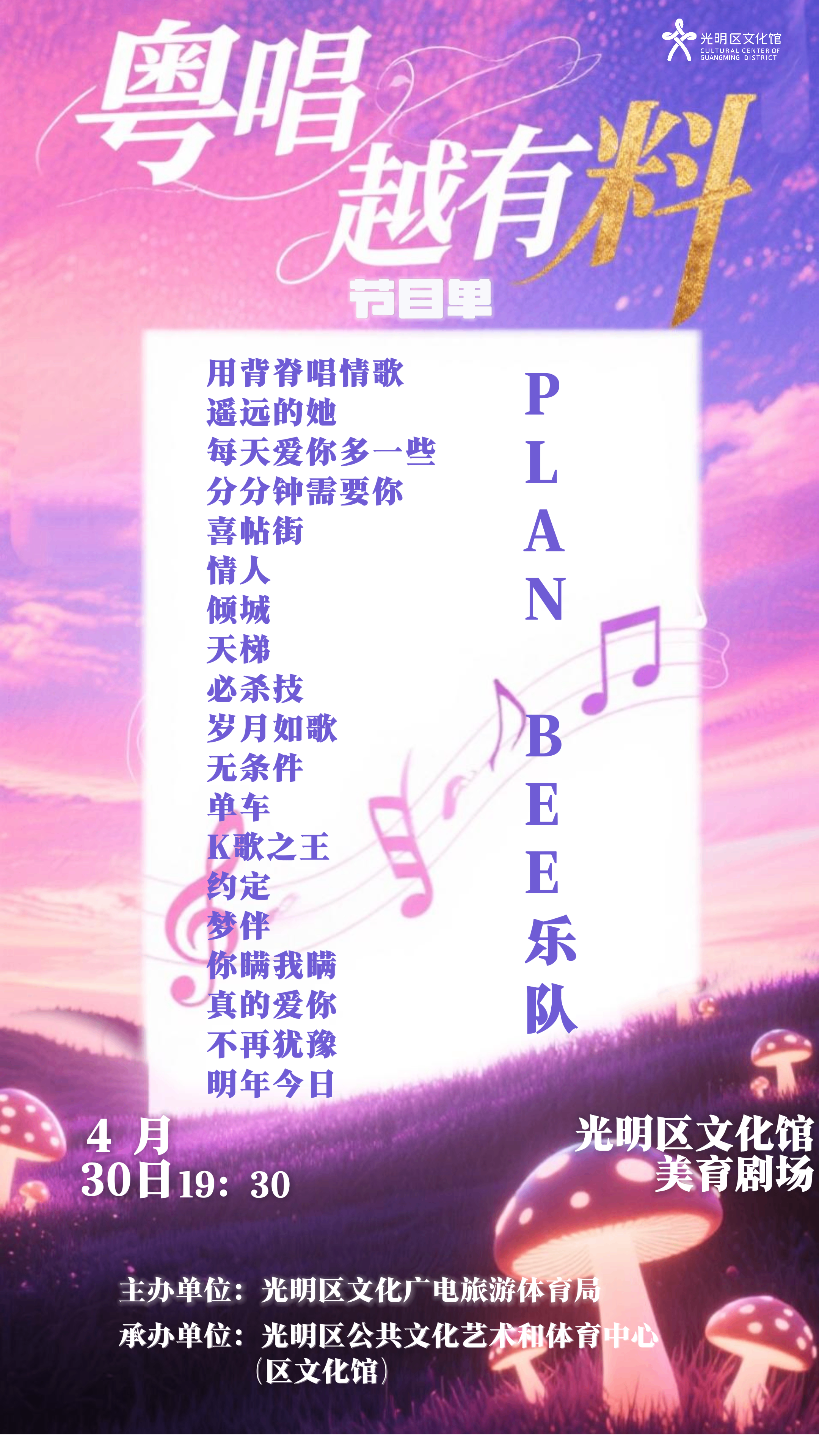 3.关于取消报名:若因个人原因不能及时参与线下检票,需提前在【线上抢票时间】内登录文化馆官网进入个人账号(我的-个人中心-公益演出记录)自行取消。取消报名后不能再次参与本次活动抢票!